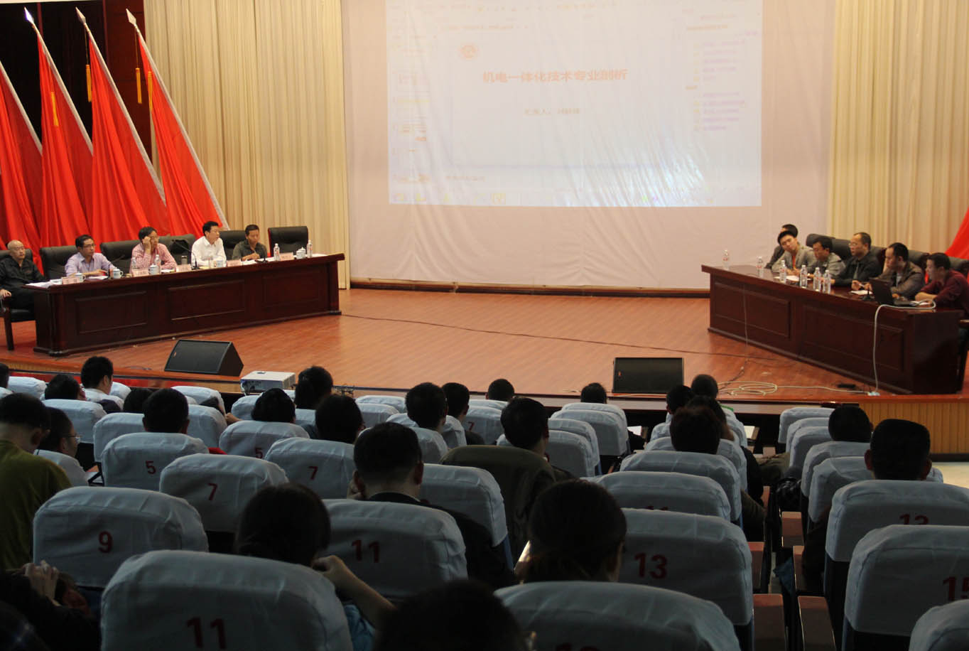 2013年9月12日下午,学院全体教师齐聚学术报告厅,现场聆听、观摩专业剖析答辩质询。三个教学团队进行专业剖析自评汇报,党委书记马传松教授等5人组成的校内专家组进行现场质询,开放的专业剖析旨在答辩互动找问题,切实加强专业内涵建设。副院长彭光辉主持会议。