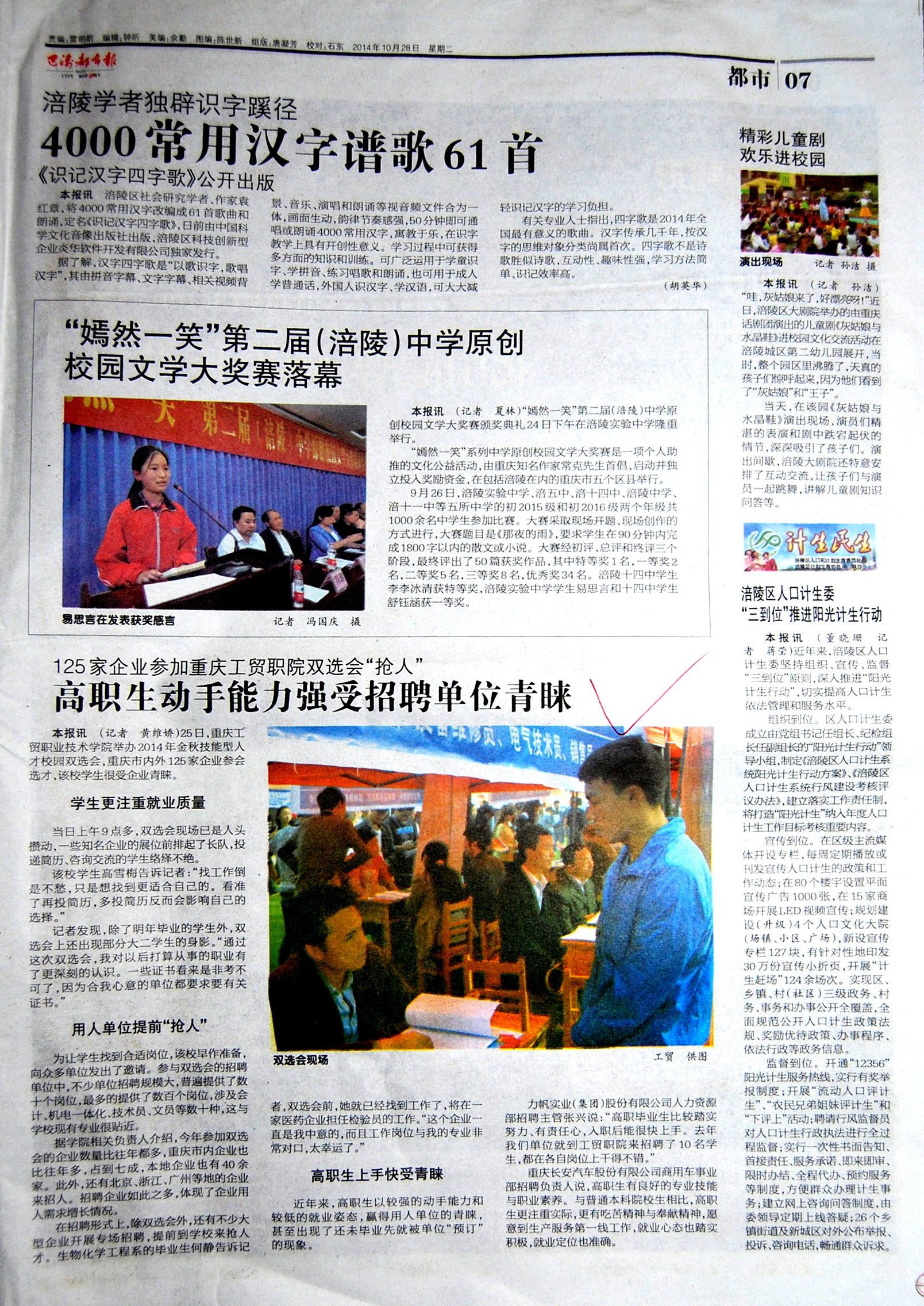 编者按:近年来我院毕业生以扎实理论知识、过硬的专业技能和良好的职业素养赢得了用人单位的青睐,甚至个别专业的毕业生在双选会前就被用人单位一抢而空,出现了供不应求的现象。为此,《巴渝都市报》以“125家企业参加重庆工贸职院双选会‘抢人’,高职生动手能力强受招聘单位青睐”为题报道了我院2014年秋季校园双选会及就业情况。