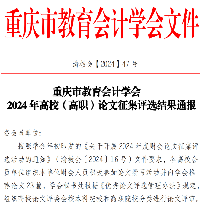 在重庆市教育会计学会举办的2024年度优秀论文评选活动中,经过专家评审组的严格评审,我校李金峰老师的论文《大数据驱动下高校财务管理决策优化》在高职院校评选中脱颖而出,荣获一等奖。