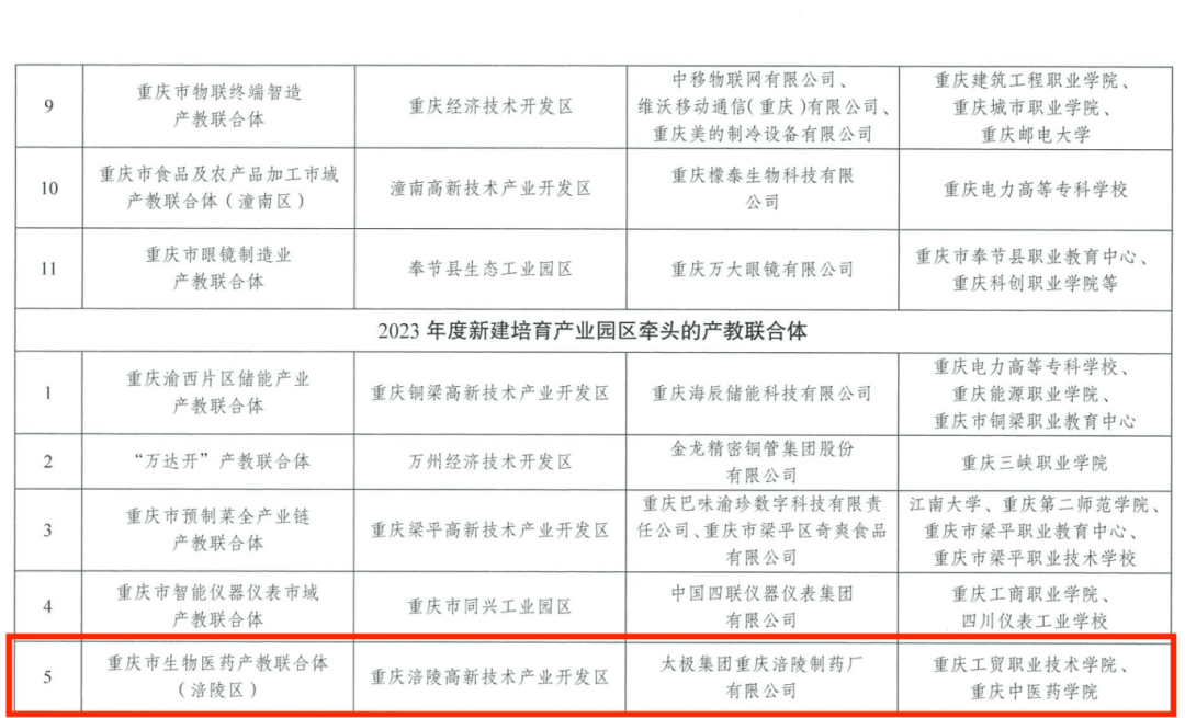 近日,市经济信息委、市教委联合印发《关于公布2024年度市域产教联合体名单的通知》(渝经信发﹝2025﹞17号),共有16个产业园区牵头、11个行业企业牵头的27个联合体在列。其中,由我校联合重庆涪陵高新技术产业开发区、太极集团重庆涪陵制药厂、重庆中医药学院等共同牵头成立的重庆市生物医药产教联合体(涪陵区)和联合重庆华峰化工有限公司、重庆白涛工业园区、长江师范学院等共同牵头成立的重庆市化工新材料智能制造产教联合体成功入选。
