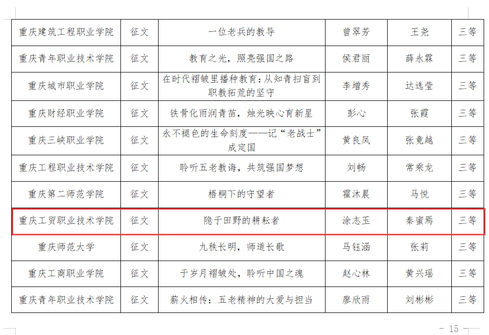 近日,重庆市教委关工委公布了2025年“读懂中国”活动获奖名单。我校在此次活动中表现突出,由涂志玉同学撰写、秦蜜焉老师指导的征文作品《隐于田野的耕耘者》荣获三等奖。
