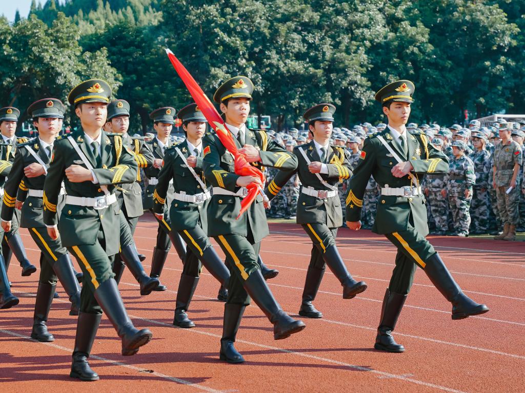 上午9时,全体师生注视国旗护卫队护送国旗入场,2025级新生军训动员大会在庄严的国歌声中拉开帷幕。