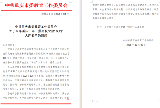 近日,中共重庆市委教育工委公布了全市第三批新时代高校党建示范创建和质量创优工作入库名单。我校教育学院教工学生党支部凭借突出的党建创新实践与育人成效,成功入选“全市党建工作样板支部”。