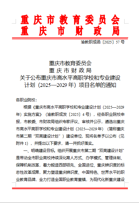 近日,重庆市教育委员会、重庆市财政局联合公示重庆市第二期“高水平高职学校和专业建设计划”(2025—2029年)立项单位名单,我校成功入选。这标志着学校办学质量与专业建设水平获得市级主管部门的高度认可,是学校坚守职业教育类型定位、深化内涵发展的重要里程碑,也为推动学校高质量发展注入新的强劲动力。