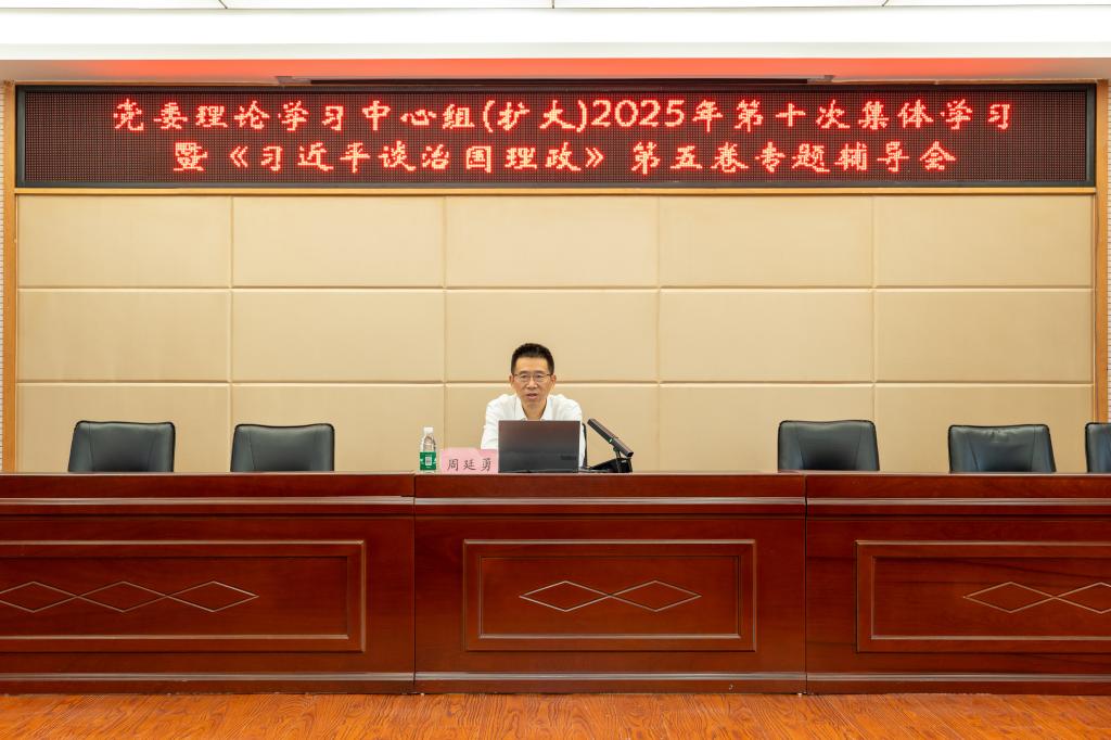 本次会议以深入学习《习近平谈治国理政》第五卷为主题,特邀中共重庆市委党史研究室副主任、市委宣讲团成员周廷勇作专题辅导报告。周廷勇围绕《习近平谈治国理政》第五卷的时代背景、重大主题与实践要求,从“时代背景与实践基础”“重大主题与路向选择”“伟大飞跃与自我革命”三个维度,系统阐释了习近平新时代中国特色社会主义思想的科学体系和精髓要义。
